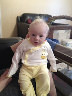 David is getting bigger and he is so much more alert. We have a good time talking to him and having him smile and coo in return. It melts our hearts. David does not like tummy time. He cries for a few minutes and then falls asleep. We try to prop him up with the bobby and he's getting better at trying to hold his head up. He is fitting into some of his three month clothes. :)